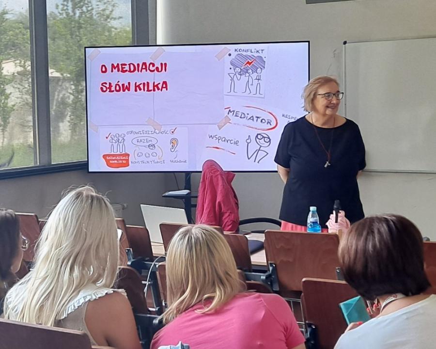 Po części oficjalnej mieliśmy okazję uczestniczyć w warsztatach dotyczących sztuki mediacji Zostań mistrzem mediacji-mediacyjne Koło Fortuny oraz Zgoda story- jak rozwiązywać konflikty po ludzku według mediatorów rówieśniczych. Na zakończenie spotkania obejrzeliśmy ciekawy pokaz magika Piotra Złotego.