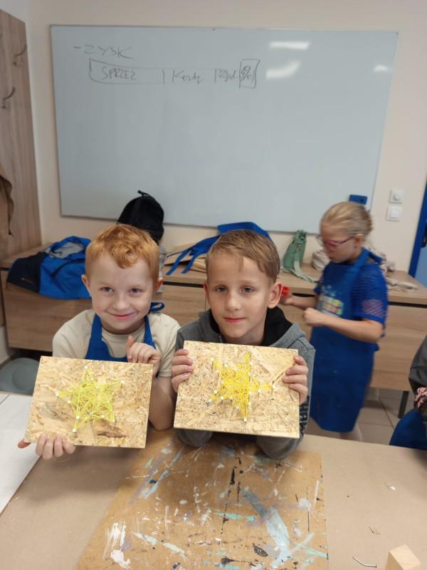 29 maja uczniowie klasy 3 uczestniczyli w kreatywnych warsztatach „Majsterkowo”, zorganizowanych przez Castoramę w Kaliszu. Zajęcia miały na celu rozbudzanie pasji do majsterkowania, rozwijanie wyobraźni oraz doskonalenie umiejętności manualnych dzieci. Tematem technicznych zmagań były skarbonki z drewna oraz obrazy z drewnianych elementów przeplatane kolorową wełną. Pod czujnym okiem wykwalifikowanych pracowników Castoramy uczniowie samodzielnie składali swoje skarbonki, przybijali gwoździe i łączyli drewniane elementy, a następnie z zapałem je ozdabiali według własnych pomysłów. W drugiej części zajęć dzieci wykonały drewniane obrazy, które również wymagały precyzji i twórczego podejścia. Nie zabrakło też słodkiego poczęstunku, a na zakończenie każdy uczestnik otrzymał pamiątkowy dyplom oraz drobny upominek.